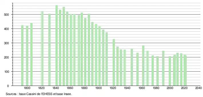 L'évolution du nombre d'habitants est connue à travers les recensements de la population effectués dans la commune depuis 1793. Pour les communes de moins de 10 000 habitants, une enquête de recensement portant sur toute la population est réalisée tous les cinq ans, les populations légales des années intermédiaires étant quant à elles estimées par interpolation ou extrapolation[32]. Pour la commune, le premier recensement exhaustif entrant dans le cadre du nouveau dispositif a été réalisé en 2005[33].