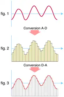 La restitution du son original se fait en réalisant l’opération inverse qui consiste à lire l’information numérique stockée en mémoire et à la convertir en signal analogique : on utilise pour cela un convertisseur Digital-Analogique ou D-A (fig. 3) (en anglais DAC pour Digital to Analog Converter). C'est le nombre de convertisseurs qui détermine la capacité de l'orgue numérique à gérer simultanément la conversion de plusieurs échantillons.