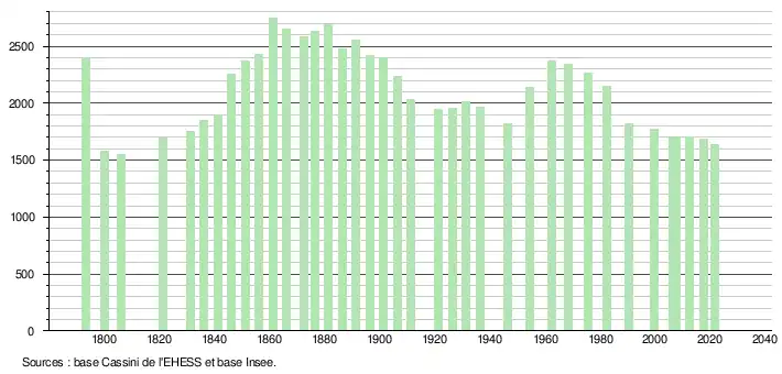 L'évolution du nombre d'habitants est connue à travers les recensements de la population effectués dans la commune depuis 1793. Pour les communes de moins de 10 000 habitants, une enquête de recensement portant sur toute la population est réalisée tous les cinq ans, les populations légales des années intermédiaires étant quant à elles estimées par interpolation ou extrapolation[35]. Pour la commune, le premier recensement exhaustif entrant dans le cadre du nouveau dispositif a été réalisé en 2007[36].