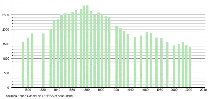 L'évolution du nombre d'habitants est connue à travers les recensements de la population effectués dans la commune depuis 1793. Pour les communes de moins de 10 000 habitants, une enquête de recensement portant sur toute la population est réalisée tous les cinq ans, les populations légales des années intermédiaires étant quant à elles estimées par interpolation ou extrapolation[19]. Pour la commune, le premier recensement exhaustif entrant dans le cadre du nouveau dispositif a été réalisé en 2006[20].