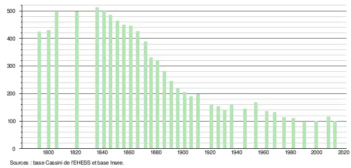 L'évolution du nombre d'habitants est connue à travers les recensements de la population effectués dans la commune depuis 1793. À partir du , les populations légales des communes sont publiées annuellement dans le cadre d'un recensement qui repose désormais sur une collecte d'information annuelle, concernant successivement tous les territoires communaux au cours d'une période de cinq ans. Pour les communes de moins de 10 000 habitants, une enquête de recensement portant sur toute la population est réalisée tous les cinq ans, les populations légales des années intermédiaires étant quant à elles estimées par interpolation ou extrapolation[5]. Pour la commune, le premier recensement exhaustif entrant dans le cadre du nouveau dispositif a été réalisé en 2008[6],[Note 2].