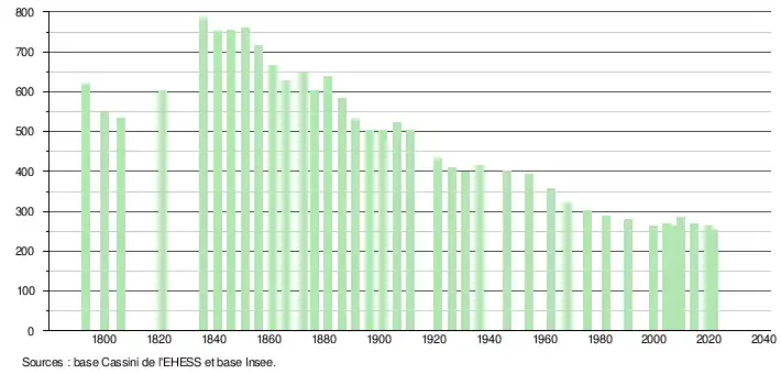 L'évolution du nombre d'habitants est connue à travers les recensements de la population effectués dans la commune depuis 1793. Pour les communes de moins de 10 000 habitants, une enquête de recensement portant sur toute la population est réalisée tous les cinq ans, les populations légales des années intermédiaires étant quant à elles estimées par interpolation ou extrapolation[20]. Pour la commune, le premier recensement exhaustif entrant dans le cadre du nouveau dispositif a été réalisé en 2004[21].