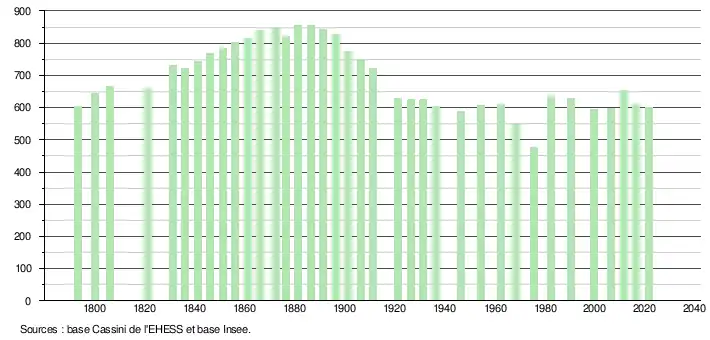 L'évolution du nombre d'habitants est connue à travers les recensements de la population effectués dans la commune depuis 1793. Pour les communes de moins de 10 000 habitants, une enquête de recensement portant sur toute la population est réalisée tous les cinq ans, les populations légales des années intermédiaires étant quant à elles estimées par interpolation ou extrapolation[16]. Pour la commune, le premier recensement exhaustif entrant dans le cadre du nouveau dispositif a été réalisé en 2006[17].
