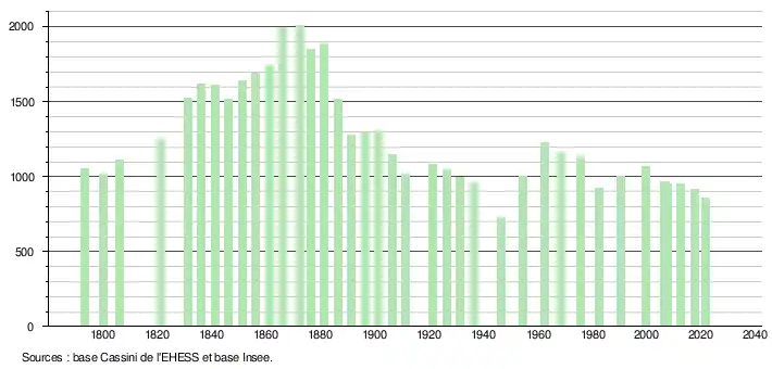 L'évolution du nombre d'habitants est connue à travers les recensements de la population effectués dans la commune depuis 1793. Pour les communes de moins de 10 000 habitants, une enquête de recensement portant sur toute la population est réalisée tous les cinq ans, les populations légales des années intermédiaires étant quant à elles estimées par interpolation ou extrapolation[26]. Pour la commune, le premier recensement exhaustif entrant dans le cadre du nouveau dispositif a été réalisé en 2007[27].