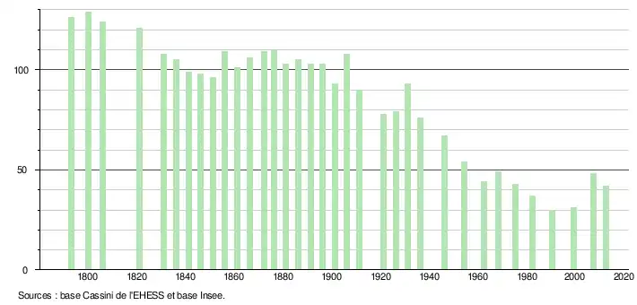 - Par convention dans Wikipédia, le principe a été retenu de n’afficher dans le tableau des recensements et le graphique, pour les populations légales postérieures à 1999, que les populations correspondant à une enquête exhaustive de recensement pour les communes de moins de 10 000 habitants, et que les populations des années 2006, 2011, 2016, etc. pour les communes de plus de 10 000 habitants, ainsi que la dernière population légale publiée par l’Insee pour l'ensemble des communes.