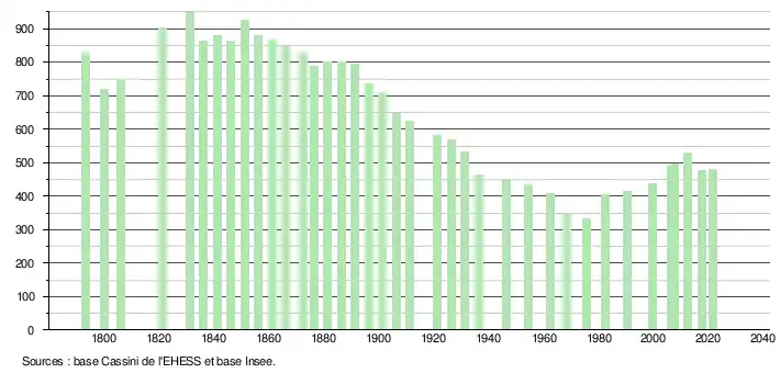 L'évolution du nombre d'habitants est connue à travers les recensements de la population effectués dans la commune depuis 1793. Pour les communes de moins de 10 000 habitants, une enquête de recensement portant sur toute la population est réalisée tous les cinq ans, les populations légales des années intermédiaires étant quant à elles estimées par interpolation ou extrapolation[19]. Pour la commune, le premier recensement exhaustif entrant dans le cadre du nouveau dispositif a été réalisé en 2007[20].