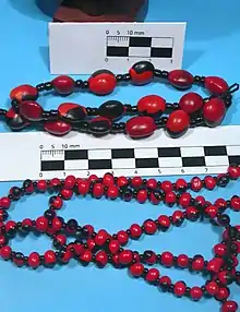 Les graines d’Ormosia coccinea sont très utilisées dans le bassin amazonien pour l'artisanat amérindien (ex : Wayanas) : colliers, bracelets et autres bijoux[4]... Au Guyana, elles sont utilisées chez les enfants Arawak pour jouer et parfois pour leur apprendre à compter. Elles servent de perles ou sont conservées sur soi comme porte-bonheur[10].