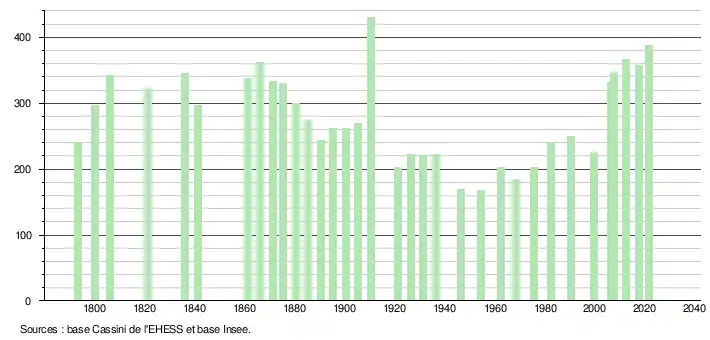 L'évolution du nombre d'habitants est connue à travers les recensements de la population effectués dans la commune depuis 1793. Pour les communes de moins de 10 000 habitants, une enquête de recensement portant sur toute la population est réalisée tous les cinq ans, les populations légales des années intermédiaires étant quant à elles estimées par interpolation ou extrapolation[17]. Pour la commune, le premier recensement exhaustif entrant dans le cadre du nouveau dispositif a été réalisé en 2007[18].