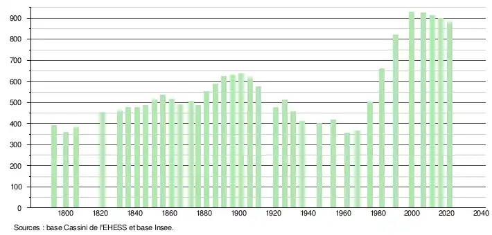 L'évolution du nombre d'habitants est connue à travers les recensements de la population effectués dans la commune depuis 1793. Pour les communes de moins de 10 000 habitants, une enquête de recensement portant sur toute la population est réalisée tous les cinq ans, les populations légales des années intermédiaires étant quant à elles estimées par interpolation ou extrapolation[32]. Pour la commune, le premier recensement exhaustif entrant dans le cadre du nouveau dispositif a été réalisé en 2006[33].