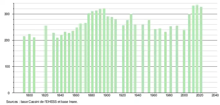 L'évolution du nombre d'habitants est connue à travers les recensements de la population effectués dans la commune depuis 1793. Pour les communes de moins de 10 000 habitants, une enquête de recensement portant sur toute la population est réalisée tous les cinq ans, les populations légales des années intermédiaires étant quant à elles estimées par interpolation ou extrapolation[15]. Pour la commune, le premier recensement exhaustif entrant dans le cadre du nouveau dispositif a été réalisé en 2006[16].