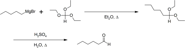L'orthoformiate d'éthyle sert, en chimie, de solvant et/ou de réactif comme dans la synthèse d'aldéhyde de Bodroux-Chichibabin[5] :