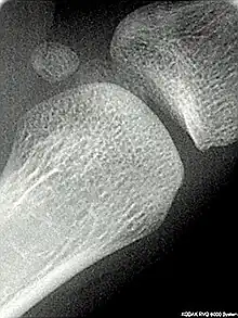 - La fabella est un petit os sésamoïde trouvé dans le tendon du chef latéral du muscle gastrocnémien derrière le condyle latéral du fémur chez 10% à 30% des individus[6].