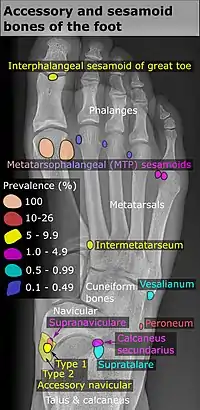 - Prevalences: Chen W, Cheng J, Sun R et Zhang Z, « Prevalence and variation of sesamoid bones in the hand: a multi-center radiographic study. », Int J Clin Exp Med, vol. 8, no 7, , p. 11721–6 (PMID 26380010, PMCID 4565393) - « Poster Abstracts », Association for Sports Medicine of Serbia (Udruženje za medicinu sporta Srbije), (consulté le ), citing: Natsis K., Beletsiotis A., Terzidis I. et Gigis P., « A study of the accessory bones of the foot. Incidence in the Greek population-clinical significance »