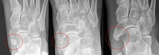Il peut être confondu avec une fracture par avulsion des tubercules latéral ou médial du processus postérieur du talus.