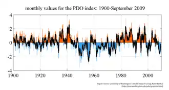 L’oscillation décennale du Pacifique est une fluctuation sur une période de 20 à 30 ans de la température de surface de la mer. Les satellites comme TOPEX/Poseidon ont permis de repérer de larges zones où la température est supérieure ou inférieure à la normale[2].