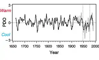 Des indices de l’occurrence de l’ODP depuis 1661 ont été tirés de la chronologie des cercles de croissance des arbres en péninsule de Basse-Californie et en Californie du Sud[6]. Même si l'effet de l'oscillation est mêlé à d’autres effets climatologiques, le changement assez brusque entre les phases chaudes et froides est assez évident pour être reconnu.