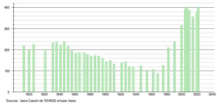 L'évolution du nombre d'habitants est connue à travers les recensements de la population effectués dans la commune depuis 1793. Pour les communes de moins de 10 000 habitants, une enquête de recensement portant sur toute la population est réalisée tous les cinq ans, les populations légales des années intermédiaires étant quant à elles estimées par interpolation ou extrapolation[22]. Pour la commune, le premier recensement exhaustif entrant dans le cadre du nouveau dispositif a été réalisé en 2004[23].
