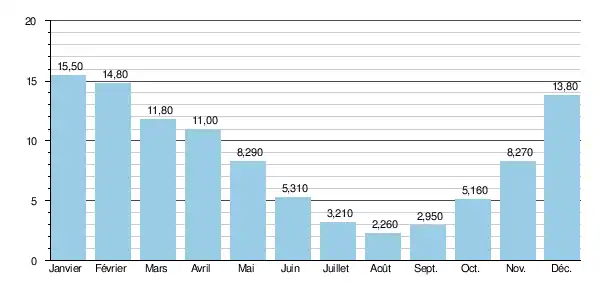 Toujours à cet endroit, le débit instantané maximal enregistré a été de 162 m3/s, le 14 mars 2001.