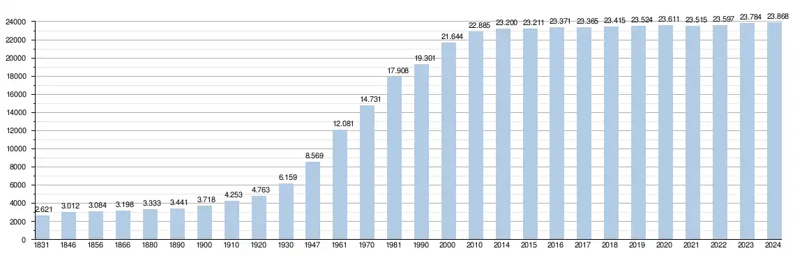 Elle comptait, au début 2024, 23 890 habitants (12 044 hommes et 11 846 femmes), soit une densité de 202,29 habitants/km²[4] pour une superficie de 116,37 km².
