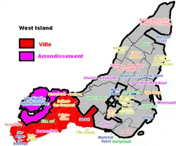 De manière générale, l'Ouest-de-l'Île comprend les villes de Baie-D'Urfé, Beaconsfield, Dollard-Des Ormeaux, Dorval, L'Île-Dorval, Kirkland, Pointe-Claire, Sainte-Anne-de-Bellevue, le village de Senneville et les deux arrondissements montréalais de L'Île-Bizard–Sainte-Geneviève et de Pierrefonds-Roxboro. Par extension, les arrondissements de Lachine, LaSalle et Saint-Laurent sont parfois inclus comme faisant partie de l'Ouest-de-l'Île. Le secteur ne bénéficie toutefois pas de limites territoriales et de structure administrative officielles et est davantage distingué par des caractéristiques sociologiques, telles que le revenu par ménage, la langue parlée à la maison, l'urbanisme des quartiers et des espaces bâtis et le partage de services publics et de lieux communs. Toutefois, le territoire de certains organismes publics, tels que ceux relatifs à l'éducation[3] et à la santé[4] peuvent avoir des frontières qui s'apparentent aux limites habituellement reconnues de l'Ouest-de-l'Île.