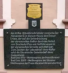 « en juillet 1863, le ministre de l'Intérieur, Piotr Valouïev, avait interdit les livres ukrainiens, les écoles ukrainiennes, les associations ukrainiennes hromady[2], tout comme en mai 1876, le tsar Alexandre II, par l'oukase d'Ems, avait interdit l'importation de livres ukrainiens, la publication de livres ukrainiens, l'enseignement de l'ukrainien. »