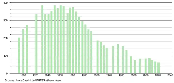 L'évolution du nombre d'habitants est connue à travers les recensements de la population effectués dans la commune depuis 1793. Pour les communes de moins de 10 000 habitants, une enquête de recensement portant sur toute la population est réalisée tous les cinq ans, les populations légales des années intermédiaires étant quant à elles estimées par interpolation ou extrapolation[24]. Pour la commune, le premier recensement exhaustif entrant dans le cadre du nouveau dispositif a été réalisé en 2005[25].