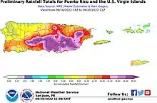 Au moins 25 décès à Porto Rico ont été attribués à l'ouragan[31],[55]. Les dégâts matériels s'élèvent à plus de 2 milliards $US, dont environ 100 millions de dollars en agriculture[32],[56].