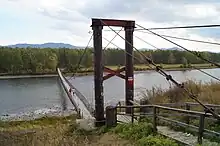 Pont automobile de la 84K-111 avec une montagne des monts de la Terekta au fond. Au premier plan, la rivière Koksa.