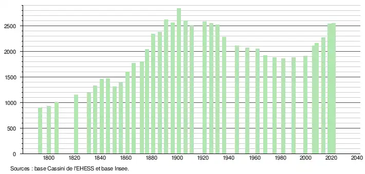 L'évolution du nombre d'habitants est connue à travers les recensements de la population effectués dans la commune depuis 1793. Pour les communes de moins de 10 000 habitants, une enquête de recensement portant sur toute la population est réalisée tous les cinq ans, les populations légales des années intermédiaires étant quant à elles estimées par interpolation ou extrapolation[34]. Pour la commune, le premier recensement exhaustif entrant dans le cadre du nouveau dispositif a été réalisé en 2008[35].