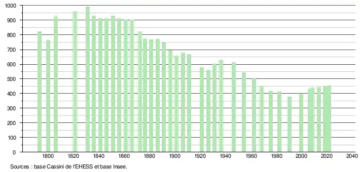 L'évolution du nombre d'habitants est connue à travers les recensements de la population effectués dans la commune depuis 1793. Pour les communes de moins de 10 000 habitants, une enquête de recensement portant sur toute la population est réalisée tous les cinq ans, les populations légales des années intermédiaires étant quant à elles estimées par interpolation ou extrapolation[20]. Pour la commune, le premier recensement exhaustif entrant dans le cadre du nouveau dispositif a été réalisé en 2008[21].