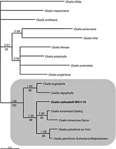 L'espèce est membre de l'alliance Oxalis tomentosa, qui comprend O. oligophylla Salter, O. hygrophila Dreyer, O. tomentosa L., O. palmifrons Salter et O. saltusbelli [3].