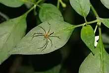 Les tibias et les tarses des palpes présentent une ligne dorsale noire. Les pattes, verdâtres[2], sont longues et fortes et couvertes d'épines noires[5]. La surface rétro-latérale des fémurs des pattes I et IV présente une ligne noire. L’extrémité distale des tibias des pattes IV est marquée d'une tache noire[2].