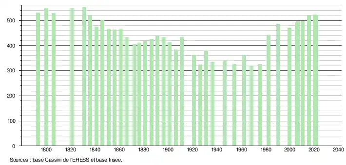 L'évolution du nombre d'habitants est connue à travers les recensements de la population effectués dans la commune depuis 1793. Pour les communes de moins de 10 000 habitants, une enquête de recensement portant sur toute la population est réalisée tous les cinq ans, les populations légales des années intermédiaires étant quant à elles estimées par interpolation ou extrapolation[24]. Pour la commune, le premier recensement exhaustif entrant dans le cadre du nouveau dispositif a été réalisé en 2005[25].