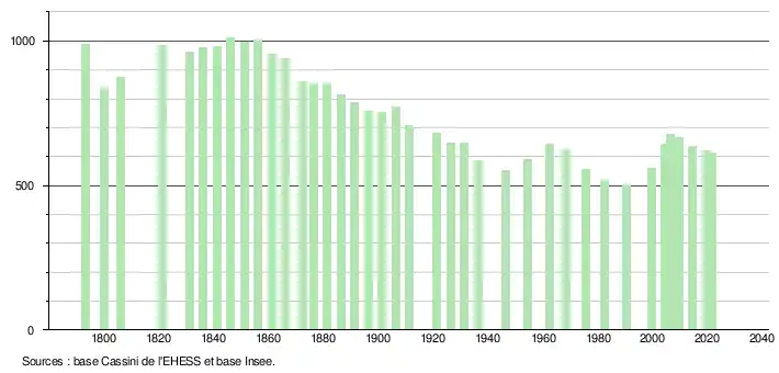 L'évolution du nombre d'habitants est connue à travers les recensements de la population effectués dans la commune depuis 1793. Pour les communes de moins de 10 000 habitants, une enquête de recensement portant sur toute la population est réalisée tous les cinq ans, les populations légales des années intermédiaires étant quant à elles estimées par interpolation ou extrapolation[15]. Pour la commune, le premier recensement exhaustif entrant dans le cadre du nouveau dispositif a été réalisé en 2004[16].