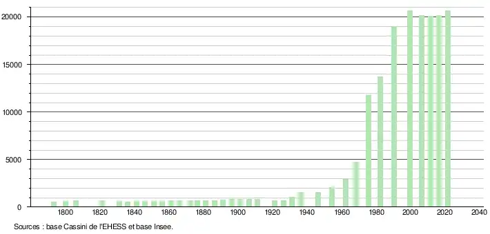 - Par convention dans Wikipédia, le principe a été retenu de n’afficher dans le tableau des recensements et le graphique, pour les populations légales postérieures à 1999, que les populations correspondant à une enquête exhaustive de recensement pour les communes de moins de 10 000 habitants, et que les populations des années 2006, 2011, 2016, etc. pour les communes de plus de 10 000 habitants, ainsi que la dernière population légale publiée par l’Insee pour l'ensemble des communes.