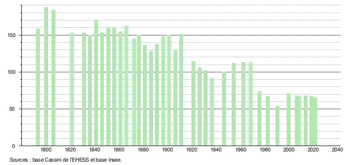 L'évolution du nombre d'habitants est connue à travers les recensements de la population effectués dans la commune depuis 1793. Pour les communes de moins de 10 000 habitants, une enquête de recensement portant sur toute la population est réalisée tous les cinq ans, les populations légales des années intermédiaires étant quant à elles estimées par interpolation ou extrapolation[18]. Pour la commune, le premier recensement exhaustif entrant dans le cadre du nouveau dispositif a été réalisé en 2008[19].
