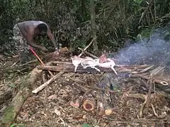 - En forêt tropicale, ils sont essentiellement frugivores, mangeant principalement des fruits (plus abondants en saison des pluies[6]), feuilles, racines et tubercules, mais pouvant éventuellement consommer les larves, insectes, amphibiens, reptiles, parmi d'autres, comme source de protéines.