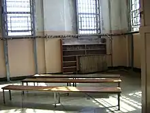 L'armurerie, où étaient stockées les armes à feu, était située dans la cour de promenade et installée sur l'un des murs extérieurs de la salle à manger[40]. Un détecteur de métal était installé à l'extérieur de la salle à manger pour des raisons de sécurité. La salle à manger disposait également de cartouches de gaz lacrymogène fixées aux chevrons du plafond qui pouvaient être activées par télécommande, si les prisonniers se révoltaient ou tentaient de s'échapper[41] [10].