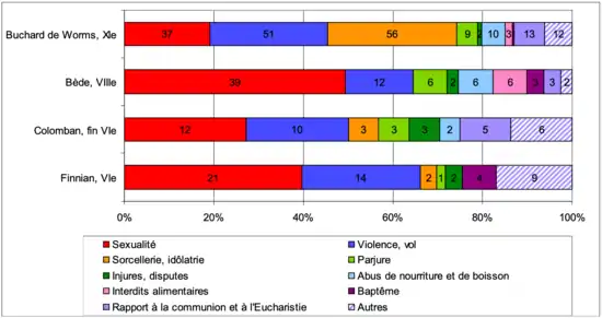 Parmi les divers crimes présent dans les pénitentiels, le respect des mœurs, notamment sexuelles, pour clercs et laïcs est un élément central, on peut le voir chez Colomban, vers 600, qui dans sa règle destinée aux moines, énonce les terribles peines qu’il faut leur infliger, surtout en matière de chasteté[6]. Mais aussi vers 730, avec Bède le Vénérable qui consacre pas moins de quarante paragraphes de son pénitentiel à la fornication.