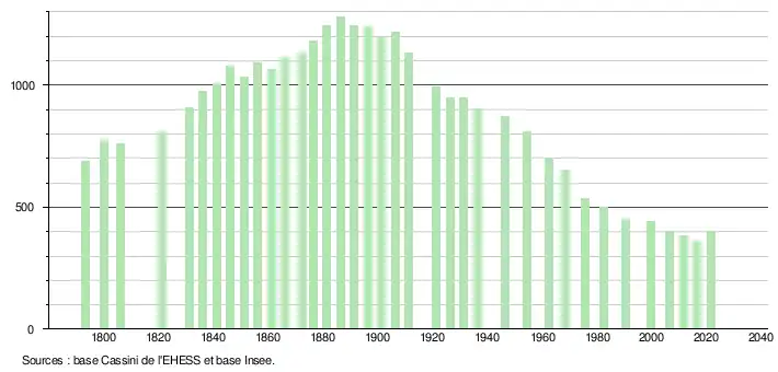 L'évolution du nombre d'habitants est connue à travers les recensements de la population effectués dans la commune depuis 1793. Pour les communes de moins de 10 000 habitants, une enquête de recensement portant sur toute la population est réalisée tous les cinq ans, les populations légales des années intermédiaires étant quant à elles estimées par interpolation ou extrapolation[32]. Pour la commune, le premier recensement exhaustif entrant dans le cadre du nouveau dispositif a été réalisé en 2006[33].