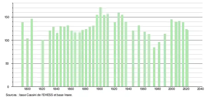L'évolution du nombre d'habitants est connue à travers les recensements de la population effectués dans la commune depuis 1793. Pour les communes de moins de 10 000 habitants, une enquête de recensement portant sur toute la population est réalisée tous les cinq ans, les populations légales des années intermédiaires étant quant à elles estimées par interpolation ou extrapolation[20]. Pour la commune, le premier recensement exhaustif entrant dans le cadre du nouveau dispositif a été réalisé en 2005[21].