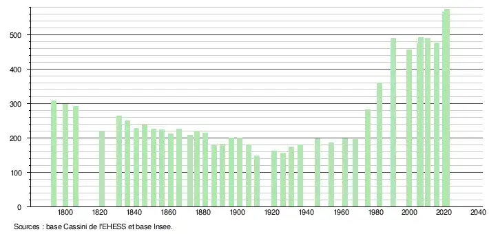L'évolution du nombre d'habitants est connue à travers les recensements de la population effectués dans la commune depuis 1793. Pour les communes de moins de 10 000 habitants, une enquête de recensement portant sur toute la population est réalisée tous les cinq ans, les populations légales des années intermédiaires étant quant à elles estimées par interpolation ou extrapolation[21]. Pour la commune, le premier recensement exhaustif entrant dans le cadre du nouveau dispositif a été réalisé en 2005[22].