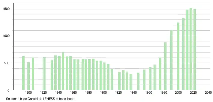 L'évolution du nombre d'habitants est connue à travers les recensements de la population effectués dans la commune depuis 1793. Pour les communes de moins de 10 000 habitants, une enquête de recensement portant sur toute la population est réalisée tous les cinq ans, les populations légales des années intermédiaires étant quant à elles estimées par interpolation ou extrapolation[36]. Pour la commune, le premier recensement exhaustif entrant dans le cadre du nouveau dispositif a été réalisé en 2006[37].