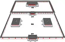 Ensuite le palais s'agrandit dans le premier secteur, avec d'autres bâtiments, de réunion probablement. Dans l'autre secteur, le bâtiment principal (qui a été ensuite dénommé le Daigokuden) est détaché du lieu de résidence du souverain. Dans le premier secteur, la gouvernance nécessite une fragmentation des tâches administratives et des lieux de décision. Dans le second secteur, concernant le souverain, le processus en cours qui assure son image d'autorité suprême, s'amplifie : il est ainsi non seulement détaché de l'élite, et n'en rencontre quelques-uns que dans le bâtiment principal, mais aussi son propre domaine privé, son lieu de résidence est devenu inaccessible aux membres de l'élite. Domaine privé où les décisions secrètes seront prises, après consultation éventuelle des quelques puissants ou influents dans le bâtiment principal. Car le souverain est alors le dirigeant suprême, le despote absolu sous le ciel, le Ten ([descendu du] ciel) - no (roi). En d'autres termes : un être transcendant. Ce processus s'est achevé avec la construction du palais des Fujiwara[14], dans la capitale Fujiwara-kyō de 694 à 710. Situé au centre de sa capitale, composée sur une grille orthogonale carrée[15], le palais sera alors placé au centre de l'enceinte avec ses trois secteurs : le premier secteur Chodoin, le bâtiment principal Daigokuden et le secteur privé, le Dairi, dans une enceinte secondaire qui englobe le Daigokuden avec deux bâtiments, situés de part et d'autre, mais séparés de lui par un mur et des portes.