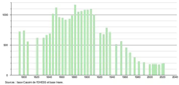 | L'évolution du nombre d'habitants est connue à travers les recensements de la population effectués dans la commune depuis 1793. Pour les communes de moins de 10 000 habitants, une enquête de recensement portant sur toute la population est réalisée tous les cinq ans, les populations légales des années intermédiaires étant quant à elles estimées par interpolation ou extrapolation[27]. Pour la commune, le premier recensement exhaustif entrant dans le cadre du nouveau dispositif a été réalisé en 2004[28]. En 2021, la commune comptait 196 habitants[Note 3], en augmentation de 10,11 % par rapport à 2015 (Corrèze : −0,86 %, France hors Mayotte : +1,84 %). |