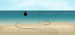La senne, dont l'extrémité inférieure est posée sur le fond selon un triangle, est tournante et remorquée, manœuvrée à partir d'un bateau au moyen de deux cordes de sennage. Une fois les cordes mises en place, le bateau tracte le dispositif à faible vitesse, pour resserrer les cordes entre elles. Ces cordages en mouvement effraient le poisson et le rabattent vers l'ouverture de la senne. La grande longueur des cordages (exemple : 2 km dans la zone des 4 milles nautiques en Suède) permet d'encercler une zone de 3 km2[6].