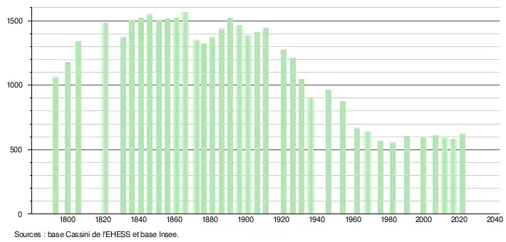 L'évolution du nombre d'habitants est connue à travers les recensements de la population effectués dans la commune depuis 1793. Pour les communes de moins de 10 000 habitants, une enquête de recensement portant sur toute la population est réalisée tous les cinq ans, les populations légales des années intermédiaires étant quant à elles estimées par interpolation ou extrapolation[32]. Pour la commune, le premier recensement exhaustif entrant dans le cadre du nouveau dispositif a été réalisé en 2006[33].