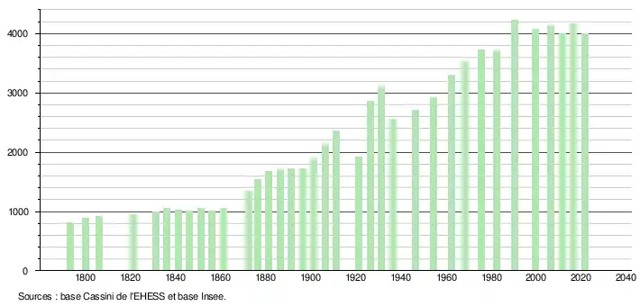 L'évolution du nombre d'habitants est connue à travers les recensements de la population effectués dans la commune depuis 1793. Pour les communes de moins de 10 000 habitants, une enquête de recensement portant sur toute la population est réalisée tous les cinq ans, les populations légales des années intermédiaires étant quant à elles estimées par interpolation ou extrapolation[22]. Pour la commune, le premier recensement exhaustif entrant dans le cadre du nouveau dispositif a été réalisé en 2006[23].