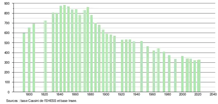 L'évolution du nombre d'habitants est connue à travers les recensements de la population effectués dans la commune depuis 1793. Pour les communes de moins de 10 000 habitants, une enquête de recensement portant sur toute la population est réalisée tous les cinq ans, les populations légales des années intermédiaires étant quant à elles estimées par interpolation ou extrapolation[18]. Pour la commune, le premier recensement exhaustif entrant dans le cadre du nouveau dispositif a été réalisé en 2005[19].