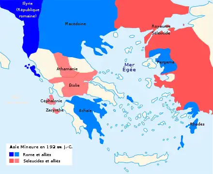 L’agitation en Grèce favorise également le déclenchement de la guerre : les Étoliens, épaulés par Nabis de Sparte, cherchent à entraîner Antiochos III et Philippe V dans leur lutte contre l’ordre établi par Rome. En 192, les Étoliens entrent en guerre, ce qui incite le Séleucide à réagir : il répond favorablement à leur demande d’intervention. Le débarquement à Démétrias de 10 000 soldats en 192 déçoit les espoirs des Étoliens en un soutien séleucide et les forces romaines apparaissent plus homogènes que les Grecs. Peu soutenu par ses alliés, battu aux Thermopyles, le roi finit par s’enfuir avec seulement 500 hommes au printemps 191[2].